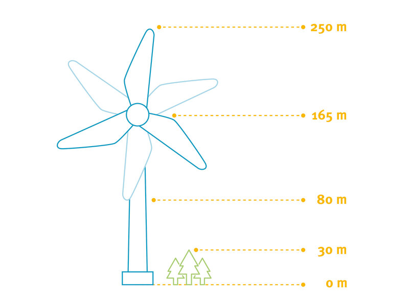 Die von uns geplanten Anlagen werden an der Spitze 250 m hoch sein. Die Nabenhöhe befindet sich auf ca. 165 m Höhe, die Rotoren haben einen Durchmesser von 160-170 Meter. Eben wegen dieser großen Höhe wirken die Anlagen vielfach schlanker als ältere, kleinere Modelle. Dies ist gut entlang der A31 Richtung Süden zu sehen. Dort stehen im Münsterland einige moderne Windkraftanlagen. Bei Windkraftanlagen im Forst enden die Rotorblätter übrigens rund 50 Meter über den Bäumen und damit weit über den Hauptflughöhen der meisten Vögel.