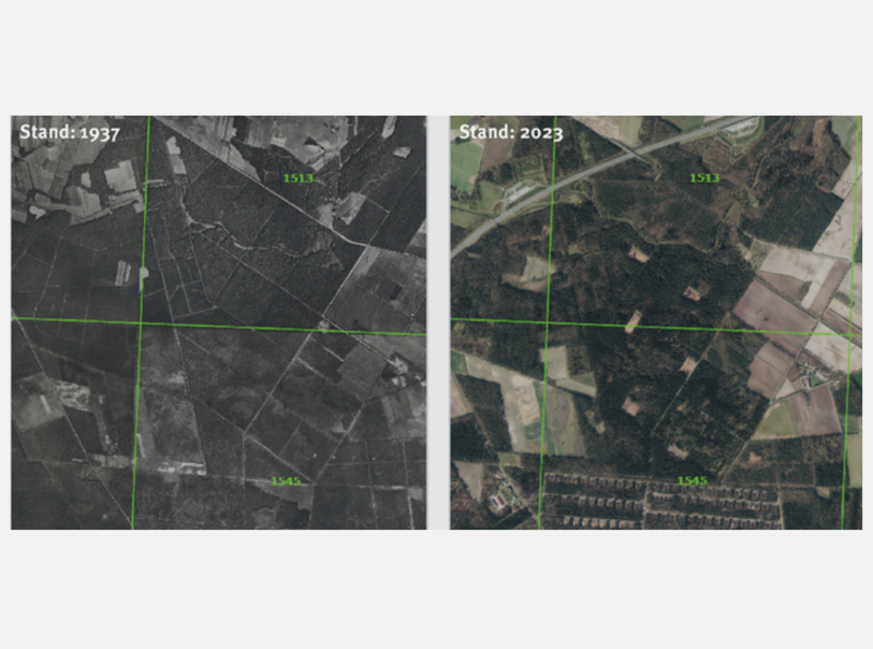 Manche Vorstellungen sind schlicht falsch. So etwa der Gedanke, für die Erschließung der von uns geplanten Windparks würden massiv neue Wege durch die Forstflächen gezogen. Die Wahrheit ist, dass dafür das mehr als 100 Jahre alte Wegesystem genutzt werden soll. Bereits Luftbilder von 1937 zeigen die mit Schotter ausgebauten Trassen – hier von der Brechte.